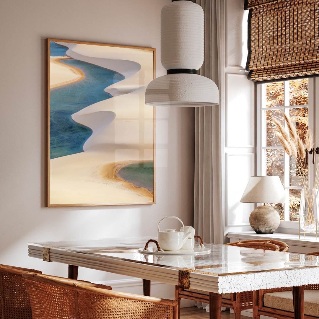 “Curvas de Areia e Azul” é contemplação em estado puro. Uma obra que convida o olhar a seguir os caminhos da areia e repousar nas águas que silenciam o tempo. Ideal para espaços que pedem respiro, leveza e uma beleza serena como o traço da natureza desenhado com vento, luz e silêncio líquido.