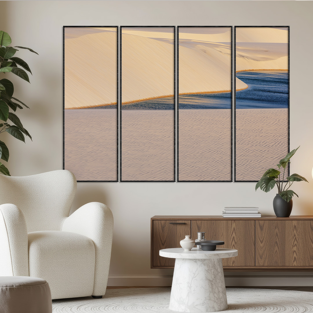 Nesta composição dividida em quatro partes, cada fragmento preserva o ritmo da curva, o respiro entre um silêncio e outro. Juntas, as peças formam uma sinfonia visual, onde o azul é o verbo e a areia, o espaço entre as palavras.