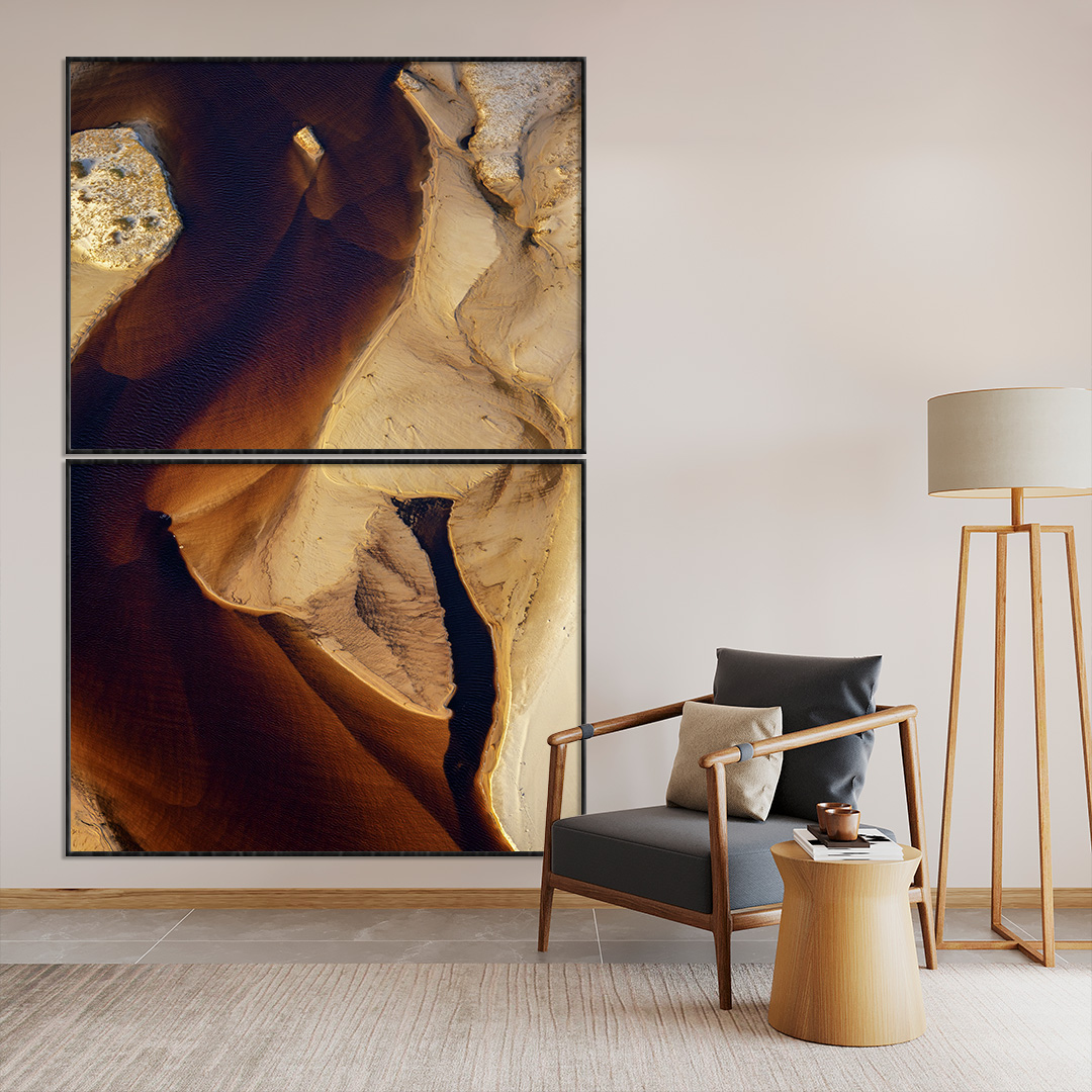 Disponível em: Papel Rag 308 g/m² Hahnemühle 100% algodão acabamento fosco e textura suave, ideal para captar a fluidez da luz e as nuances douradas que percorrem as dunas. Tela ArtCanvas Smooth 370 g/m² Hahnemühle superfície lisa e acabamento mate, que intensifica o contraste entre a claridade e a sombra, realçando a força escultórica da composição.