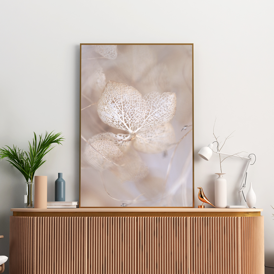 Luz tênue atravessa as camadas secas da hydrangea, revelando nervuras que brilham como veios de cristal, sombras que acariciam o interior da flor, e superfícies que guardam traços de cor e vida, mesmo quando tudo parece ter se desligado do frescor do orvalho.